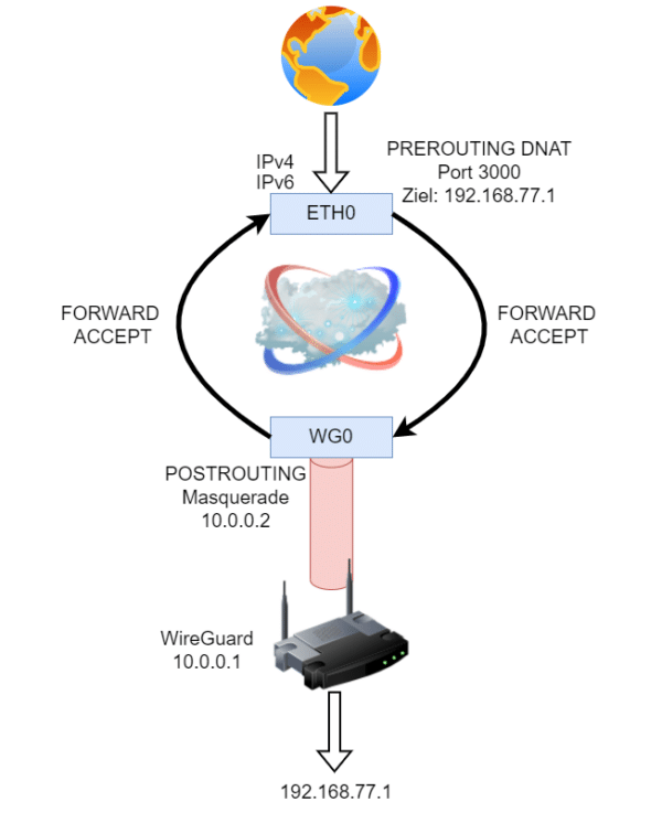 Mit dieser Konfiguration wird der Port 3000 eingehend auf dem Server mittels DNAT auf die Zieladresse 192.168.77.1 weitergeleitet. (PREROUTING)