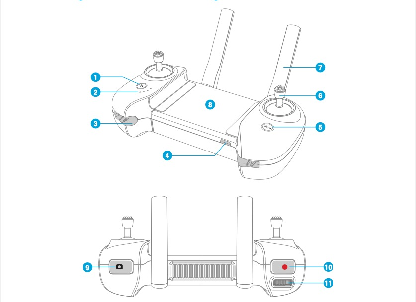 - Für zusätzliche Funktionen sind die RTH/Pause-Taste, die Fototaste und die Videoaufnahmetaste integriert.