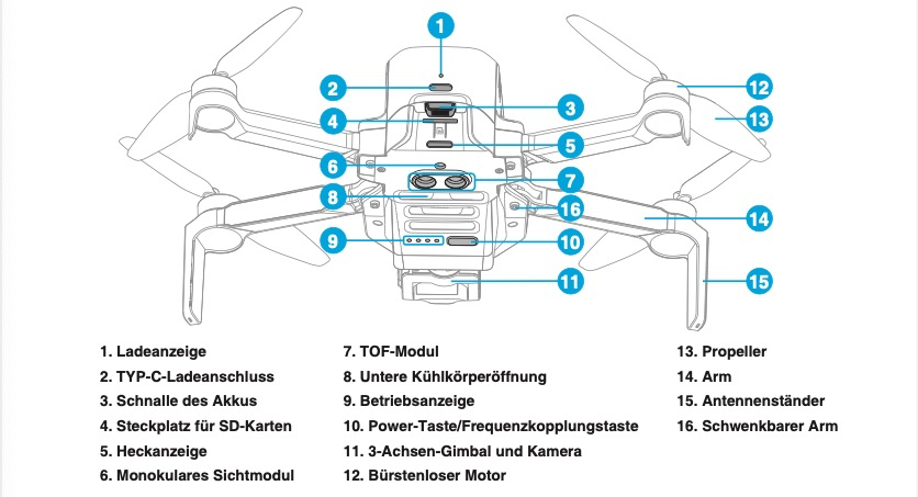 - Die Propeller sind so konstruiert, dass sie einen effizienten und stabilen Flug garantieren, unterstützt durch die faltbaren Ausleger und die stabilen Landebeine.