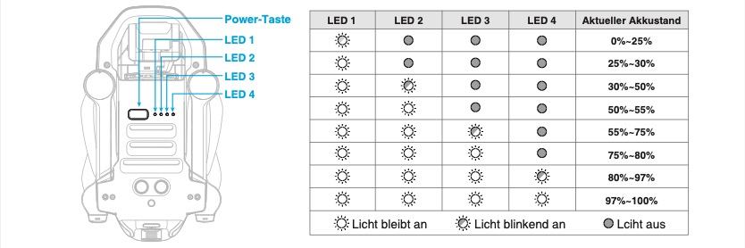 - Es wird empfohlen, die Batterien zum Laden aus der Drohne zu entfernen. Wenn du dies nicht machst und die Drohne während des Ladens eingeschaltet bleibt, schaltet sie sich automatisch aus, sobald die Batterien vollständig geladen sind.